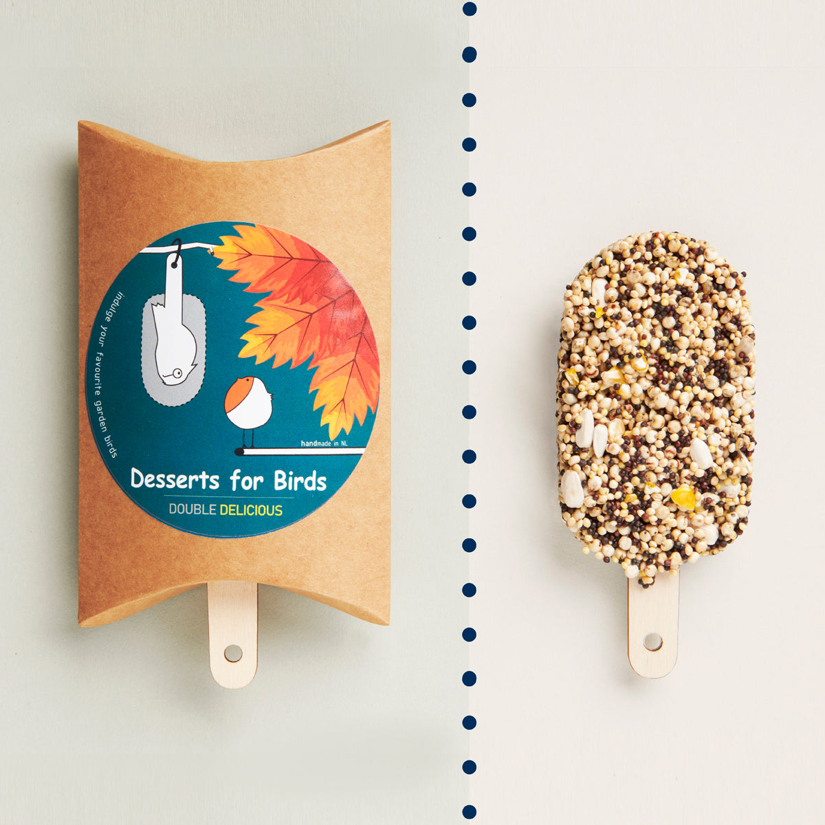 Dubbel zoveel lekkers voor de vogels én dubbel zoveel plezier voor jou! Met Desserts for Birds Double Delicious geef je je tuin of balkon een flinke dosis vrolijkheid. Deze speciale uitvoering bevat twee vogel-ijsjes, elk rijkelijk omhuld met een laag voedzame en krokante zaden waar tuinvogels geen genoeg van krijgen.