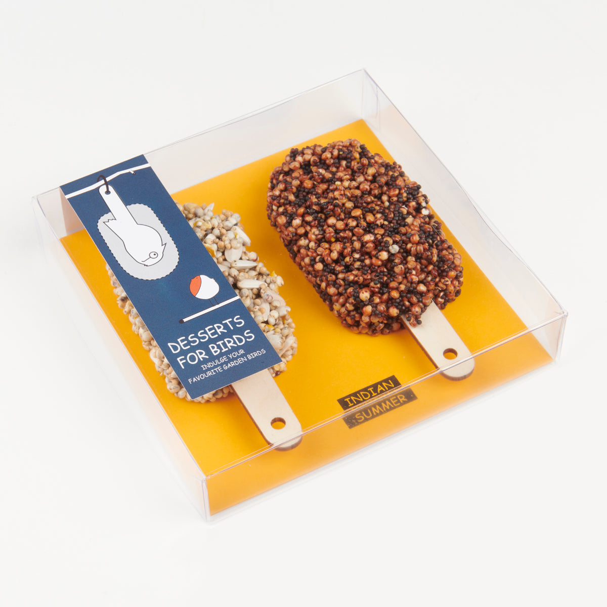 Breng de warme sfeer van de nazomer naar je tuin of balkon met Desserts for Birds Double Pack Indian Summer. Deze dubbele verpakking bevat twee vogel-ijsjes, rijkelijk bedekt met een kleurrijke mix van zaden die tuinvogels onweerstaanbaar vinden. Terwijl de vogels genieten van hun knapperige feestmaal, geniet jij van het vrolijke gefladder en gezang om je heen.